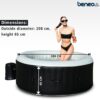 Spremenite svojo hišo ali stanovanje v luksuzno bivališče z vrhunsko NOVO vrsto vroče cevi BeneoSpa! Terapevtske koristi so pokazale številne medicinske študije. Najpogosteje se omenjajo blagodejni učinki na mišično-skeletni sistem, sproščanje vpliva na psihično plat človeka. Njena nesporna korist je tudi za našo kožo. Mehurčki jo osvajajo, masirajo in izboljšajo presnovo. Mobilna vroča cev BeneoSpa ima odlično razmerje med ceno in zmogljivostjo. Zunanji premer je 208 cm in sprejme 6 odraslih oseb. Z vgrajenim samonapihljivim sistemom je masažna kad pripravljena za uporabo v nekaj minutah, brez napora.
