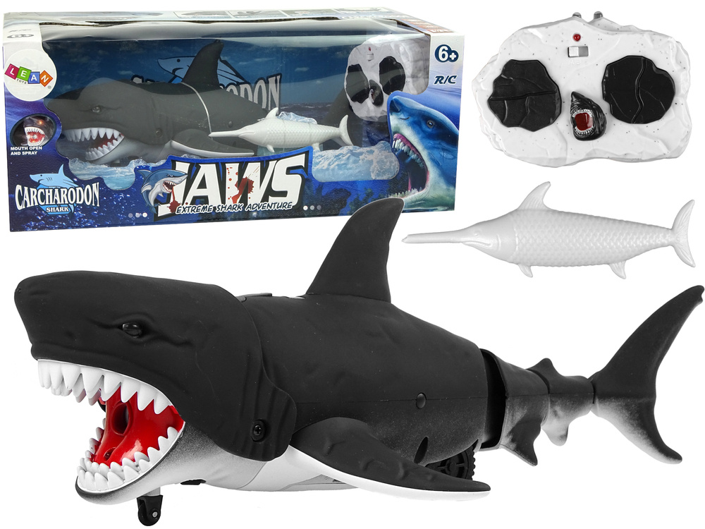 Igrača je izdelana iz visokokakovostne plastike. Vsaka podrobnost, značilni beli zobje, ostra plavut na hrbtu, dolg rep vzbujajo strah. Velika prednost je infrardeči daljinski upravljalnik. Upravljate jo lahko z daljinskim upravljalnikom. Med igro premika rep in celoten pas, žareče oči in način gibanja pa spominjajo na pravega morskega psa. Največje presenečenje je funkcija pršenja vode. Na hrbtni strani je luknja, v katero morate naliti vodo, s priloženo pipeto v obliki mečarice, ko pritisnete gumb na daljinskem upravljalniku, bo morski pes začel premikati glavo in uporabljati pršilo.
