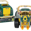 Celoten komplet je nameščen na dveh velikih kolesih, zahvaljujoč katerima lahko otrok svojo delavnico enostavno premika z enega mesta na drugega, kar spodbuja mobilnost in ustvarjalnost. To ni le igrača – je pripomoček za učenje, razvijanje spretnosti in domišljije, ki bo vsakemu malemu DIY navdušencu zagotovil ure očarljive zabave!
