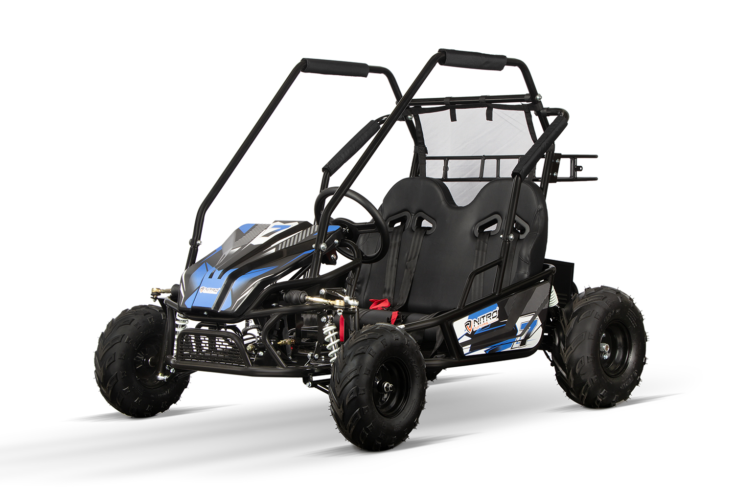 NITRO MOTORS Eco Midi PRM je zmogljiv in hkrati izjemno varen električni otroški buggy, zasnovan za nepozabno vožnjo po urejenih površinah ali lažjem terenu. Zahvaljujoč 2000-vatnemu brezkrtačnemu motorju, diferencialnemu pogonu na gred in robustni jekleni konstrukciji ponuja stabilnost, moč in zanesljivost.