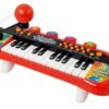 Tipkovnica ima 14 belih in 10 črnih tipk. Dodatno je v kompletu še mikrofon s stojalom, zahvaljujoč kateremu bo malček lahko pel in igral hkrati. Zunanji vhodni priključek omogoča poslušanje vaših najljubših pesmi. Odlična priložnost za organizacijo karaok.