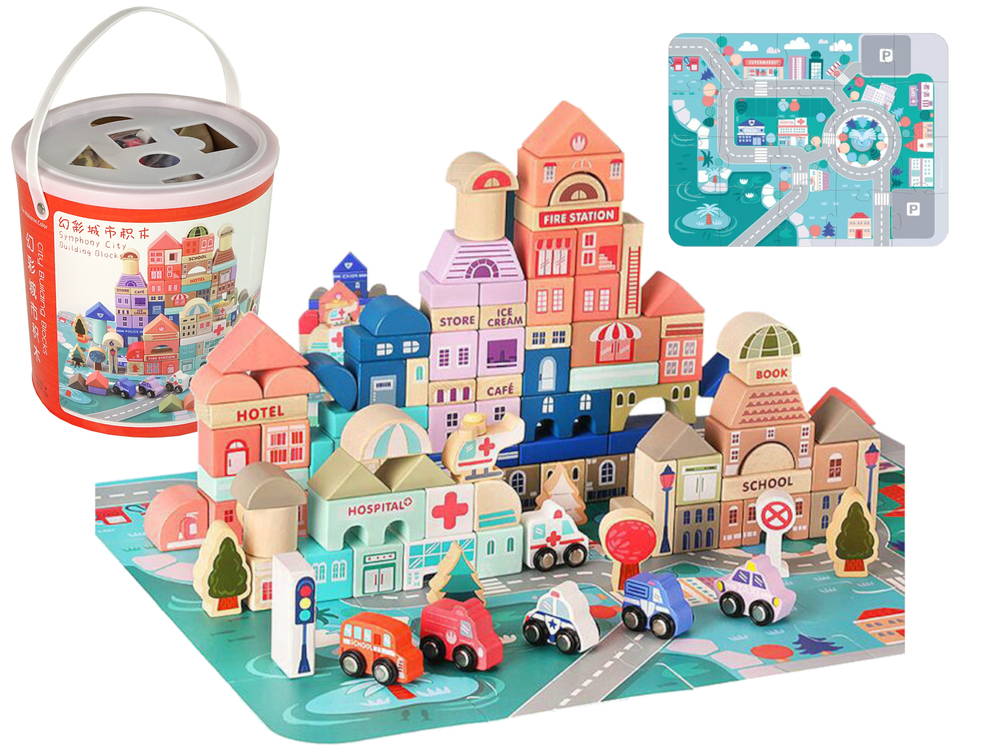 Ustvarite svoje mesto! Predstavljamo komplet lesenih kock z napisi in risbami, ki razporejene prikazujejo majhno mesto. Lesene kocke so poznane že stoletja in so fantastične za vsako generacijo, lahko spodbudijo otrokovo domišljijo in logično razmišljanje.