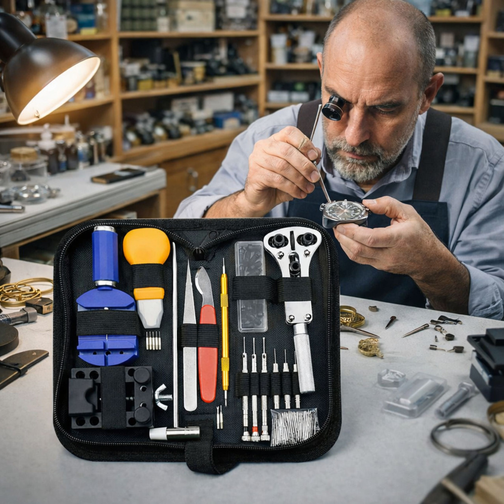 Ta profesionalni komplet za popravilo ur je celovit nabor orodij, zasnovanih za natančno upravljanje, popravilo in vzdrževanje mehanskih in kremenčevih ur. Ustvarjen je bil za tiste, ki želijo opravljati osnovna in naprednejša urarska opravila doma, brez potrebe po servisni delavnici.