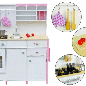 Lesena otroška kuhinja Paula v zeleno-beli kombinaciji je popolna izbira za male kuharje, ki imajo radi ustvarjalno in domišljijsko igro. Ta kakovostna kuhinja za otroke iz lesa združuje funkcionalnost, realistične detajle in izjemno estetiko, zaradi česar je odlična popestritev vsake otroške sobe.