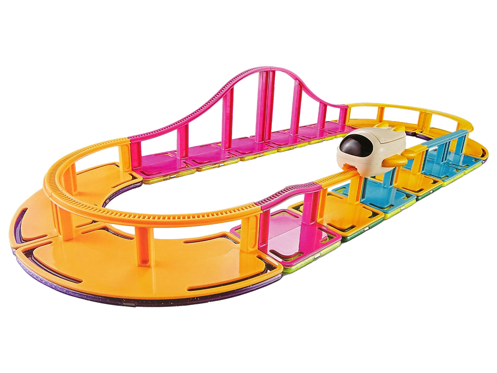 V kompletu je knjiga idej in 29 elementov, ki jih lahko otrok poveže v dirkalno stezo. Vsak geometrijski element vsebuje magnete, ki se neopazno povezujejo med seboj, so odporni proti koroziji, varni in vzdržljivi.