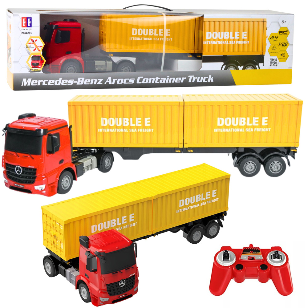 Daljinsko voden tovornjak za prevoz kontejnerjev Mercedes-Benz Arocs v merilu 1:26 je odlična izbira za otroke, stare 6 let in več. Ta model, ki ga je ustvarila priznana blagovna znamka Double Eagle, združuje realistične podrobnosti s sodobnimi funkcijami daljinskega upravljanja, kar zagotavlja ure vznemirljive igre.
