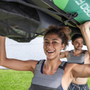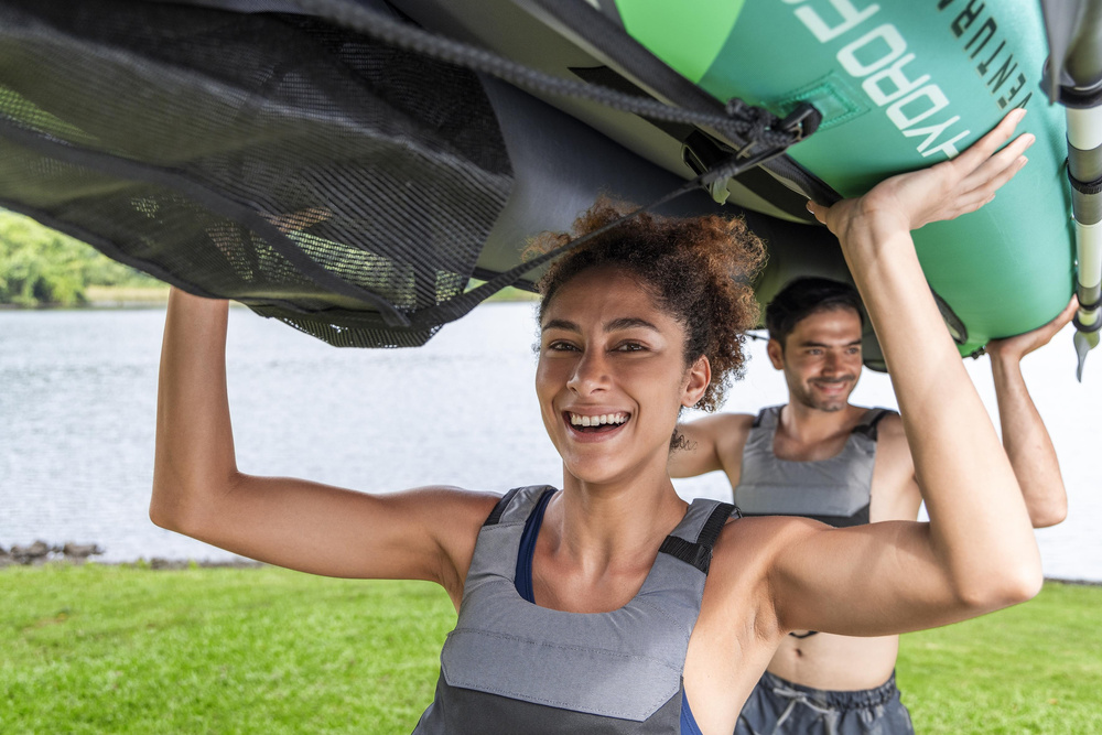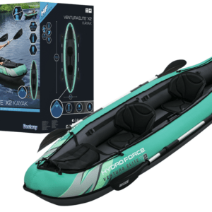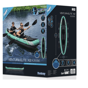 Izlet na vodo je idealen način preživljanja prostega časa. Za popestritev tega brezskrbnega časa se založite z dodatnimi dodatki za bazen. Kajak je kot nalašč tudi za rekreativni izlet po jezeru ali bazenu. Izdelan je iz trpežnega vinila, odpornega na poškodbe. Tkanina je odporna na olje, vodoodporna in odporna na intenzivne UV žarke. Visokokakovostna najlonska lupina je tudi odporna na predrtje in izdelana tako, da prenese nemirne in pogosto kamnite rečne vode. Lahko boste manevrirali skozi vijugaste reke, jezera, mirne odprte vode ali oseko in oseko valov. Zasnovano z nastavljivimi naslonjali za udobje in podporo. Poleg prostora za shranjevanje, ki se nahaja znotraj strukture plovila, je na voljo tudi odstranljiva torba za shranjevanje, ki vam omogoča dostop do vaših osnovnih stvari med veslanjem po vodi. Vesla z dvojnim rezilom so aluminijasta, lahka in poravnana z varnimi zapahi. Ko je kajak popolnoma napihnjen z ročno črpalko, je dolg 2,80 m in nosi do 200 kg. Ima robustne platnene ročaje na vsaki strani, zaradi česar je prenašanje kajaka preprosto. Kajak ima odstranljive plavuti, ki pomagajo ohranjati smerno stabilnost in povečujejo hitrost. Za shranjevanje preprosto odstranite plavuti s kajaka in ustvarite izjemno kompaktno enoto, ki prihrani prostor.