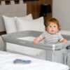 Sleep2gether je naš odgovor na naraščajoče potrebe in pričakovanja staršev. Sleep2gether se lahko uporablja kot samostojna posteljica, vendar po odstranitvi sprednje stene. Sleep2gether lahko uporabite ob strani postelje za odrasle. Tako lahko dojenčka hranite in dojite, ne da bi zapustili posteljo. Majhna teža in integrirana kolesa povečajo mobilnost, medtem ko mehanizem za nastavitev višine omogoča hitro in enostavno nastavitev. Jaslice lahko nastavite tudi pod kotom, da pomagajo uspavati otroka in preprečujejo pljuvanje.