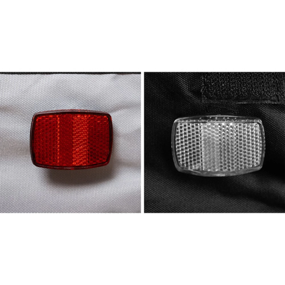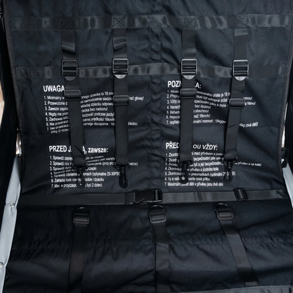 varna konstrukcija – prikolica za hojo in tek ima 4-točkovne varnostne pasove, parkirno zavoro, opozorilno zastavico in odsevne elemente, ki povečujejo vidljivost in varnost vašega otroka