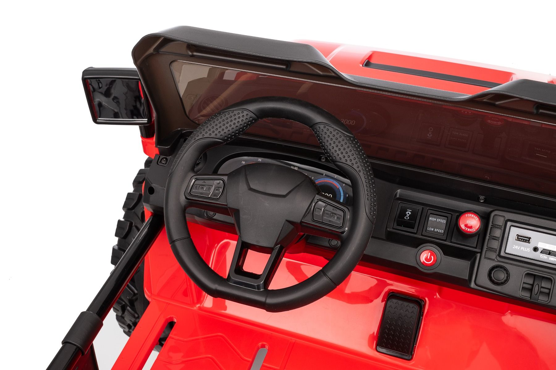 Ta električni avtomobilček ne navdušuje le s svojo zasnovo, temveč tudi z bogato opremo. Opremljen je s sprednjimi in zadnjimi LED lučmi, ki povečajo vidljivost in prispevajo k pristnemu videzu pravega vozila. Večfunkcijski volan vključuje gumbe za kul hupo, otroške pesmi in sodobno glasbo. Vgrajen MP3 predvajalnik ima vhoda USB in AUX ter omogoča nadzor glasnosti in izbiro skladb, tako da lahko mali voznik še bolj uživa v vožnji.