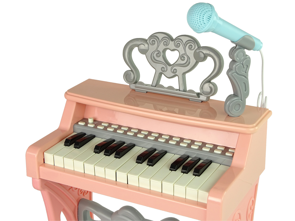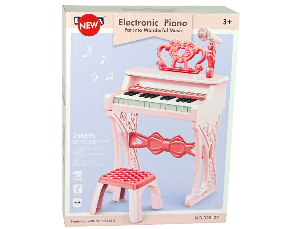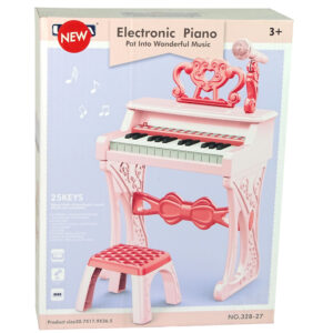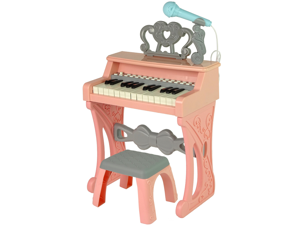 V kompletu sta tipkovnica s stojalom in roza stol s čudovitimi vzorci. Malček se lahko udobno usede in začne svoj koncert. Tipkovnica ima 15 belih in 10 črnih tipk. Dodatno je v kompletu še mikrofon z nastavkom, zahvaljujoč kateremu bo malček lahko pel in igral hkrati. Zunanji vhodni priključek omogoča poslušanje vaših najljubših pesmi. Popolna priložnost za organizacijo karaok doma in prvi nastop pred ljudmi.