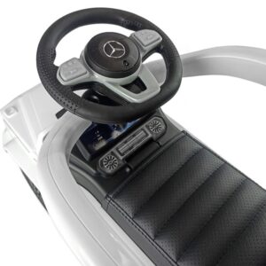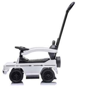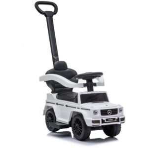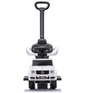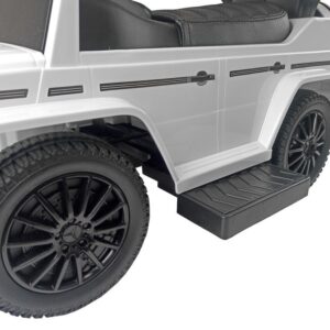Mercedes G Class ride-on je izdelan iz lahke, plastične konstrukcije, ki je zelo trpežna in trdna. Ima usnjen sedež, zaradi česar je udoben med vožnjo. Spodaj je predal za shranjevanje drobnarij, ki jih vaš malček lahko vzame s seboj na sprehod. Vgrajeno naslonjalo ščiti pred nagibanjem nazaj na enak način kot element pod vozilom.