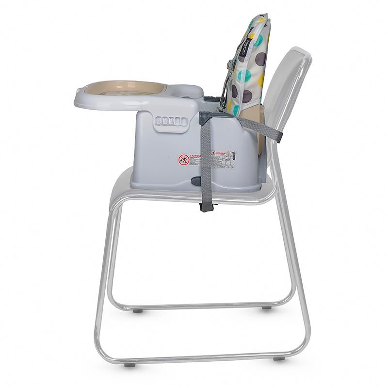 Stolček za hranjenje Coccolle Ziti se lahko uspešno integrira v vse jedilne prostore in se lahko uporablja tudi kot oporni sedež, pritrdite ga lahko na sedež in naslonjalo stola za odrasle s pomočjo trakov.