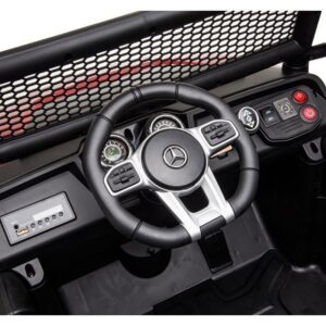 Avto Mercedes Unimog je bil zasnovan s pozornostjo do najmanjše podrobnosti, kar vpliva na pozitivne občutke mladega dirkača. Vzdržljiva in masivna konstrukcija v kombinaciji z visokokakovostnimi materiali je zaslužna za večletno odlično zabavo in odpornost proti poškodbam. Atraktivnost modela povečujejo vrata, ki se odpirajo, in blažilniki, na katere je nameščen, zaradi česar bo vožnja po neravnem in razgibanem terenu veliko bolj prijetna in avanturistična.