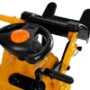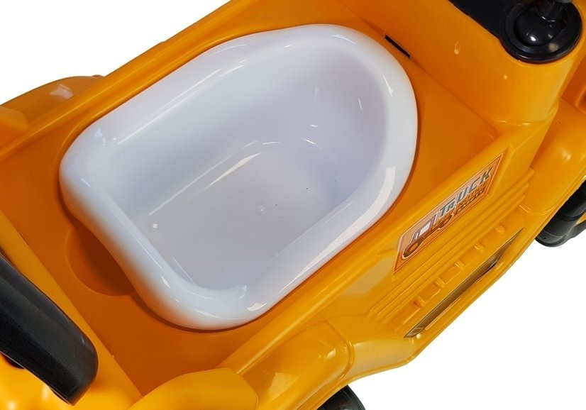 Vozilo za vožnjo je izdelano iz rumenega plastičnega ohišja s črnimi kolesnimi dodatki, vrtljivim volanom, hrbtnim naslonom in premično roko z vilicami na koncu. Sedež avtomobilčka se dvigne – spodaj je kahlica.