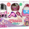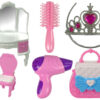 Kozmetični salon vašega otroka ima vse potrebne pripomočke za pripravo. Majhna toaletna mizica z ogledalom, sušilec za lase in krtača so le nekateri dodatki. Omogočajo vam, da svoje punčke naličite ali naredite pričesko. Zase je v kompletu čudovita krona in torbica z modro pentljo.