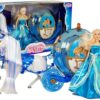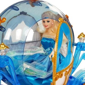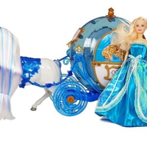 Lepa kočija v kombinaciji s konjem izgleda naravnost iz pravljice. Okrogla prozorna struktura ima vrata, ki se odpirajo, in oporo za noge, ki lutki olajša vstop v notranjost. Vozilo je postavljeno na štiri premična kolesa, njegova notranjost pa je izpopolnjena do najmanjše podrobnosti – kar dokazuje bela, prešita sedežna garnitura in stene. Kočija iz brokata ima zlate detajle v obliki vpadljivih okraskov. Belega konja krasi modra gumijasta vprega, ki se enostavno pritrdi na kočijo.