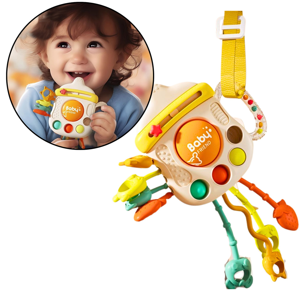 Igrača ima številne pisane vrvice, vlečke in drsalke, ki spodbujajo malčke k aktivnosti in raziskovanju. Njena oblika spominja na stekleničko za hranjenje, zaradi česar je privlačna in otrokom domača. Poseben trak omogoča pritrditev igrače na voziček, avtosedež ali otroško posteljico, kar zagotavlja, da je vedno z otrokom. Različne teksture in barve pritegnejo malčkovo pozornost.