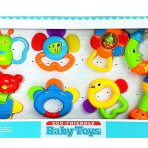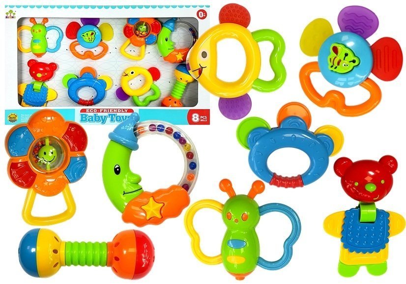 Barvit komplet 8 ropotulj in grizal različnih oblik je odlično darilo za najmlajše, ki šele odkrivajo svet. Igrače so izdelane iz kakovostne plastike, varne za dojenčke. V kompletu je 8 elementov, primernih starosti otroka. Ropotuljice imajo v notranjosti perle, zvončke in kroglice, ki spodbujajo dojenčkove čute. Dodatna prednost igrače so gumijasti elementi, ki bodo uporabni v obdobju izraščanja zobkov. Velikost in teža igrače sta primerni za držanje dojenčkovih drobnih rokic. Zahvaljujoč raznolikosti kompleta bo vaš dojenček lahko dobil novo igračo, primerno svoji starosti. Komplet zelo pozitivno vpliva na otrokov razvoj, saj mu omogoča učenje oblik in barv preko dotika in pogleda.