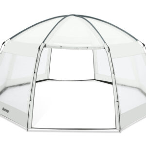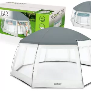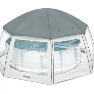 Bestway® okrogli šotor za bazen je idealna rešitev za ustvarjanje zasebnosti in zaščite na vašem dvorišču. Združljiv je z montažnimi bazeni s premerom do 4,88 m in vas učinkovito ščiti pred dežjem, soncem ter drugimi vremenskimi vplivi. Šotor ima inovativno 2-slojno zasnovo z zaščito UPF 50+, ki preprečuje prehajanje škodljivih UV-žarkov. Opremljen je z 2 vstopnima točkama in 8 velikimi prozornimi okni, ki omogočajo enostaven dostop do bazena ter pregled nad dogajanjem na dvorišču.