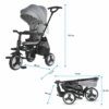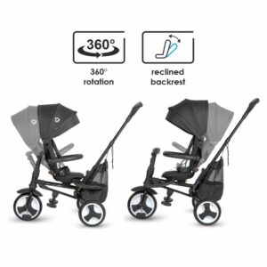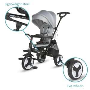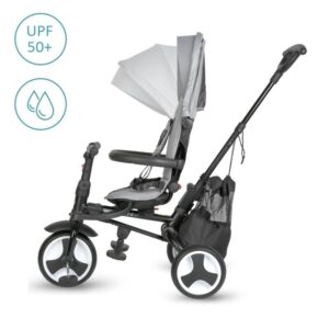 Nadstrešek tricikla nudi UV zaščito, tako da ga lahko uporabljate tudi na najbolj vročih lokacijah. Funkcija prostega kolesa omogoča zaklepanje kolesa, tako da se sprednje kolo ne bo zavrtelo, tudi če mali pedalira, zato uporaba izdelka pri mlajših otrocih ni problem. Funkcija prostega krmila omogoča otroku, da manevrira s krmilom, ne da bi spremenil smer tricikla.