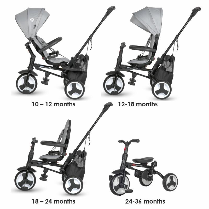 Večnamenski: lahko se uporablja od 10 mesecev do 3 let – z vsemi dodatki; V klasičnem načinu tricikla pa se lahko uporablja tudi do 5 let, odvisno od otrokove konstitucije