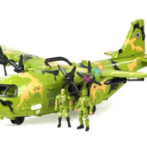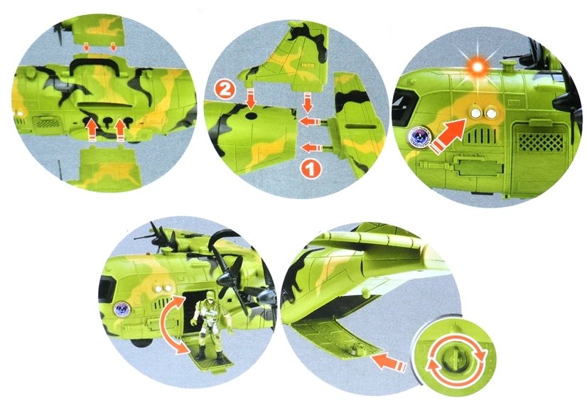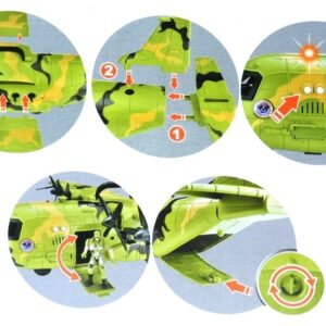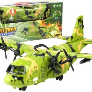 Set vojaške serije je izdelan iz certificiranega, trdnega materiala: plastike. Barve letala, popestrene z kamuflažnimi vzorci, se popolnoma ujemajo z vojaškimi barvami, zaradi česar je igrača videti zelo resnična. Letalo je zelo veliko – razpon njegovih kril je 64 cm , njegova dolžina pa 55 cm. Struktura letala vključuje premične in odpiralne elemente. Propelerji na krilih letala so vrtljivi, prav tako trojna orožja, ki štrlijo iz oken letala. Vrata na sprednjem in zadnjem delu letala se odprejo, da lahko figure postavite v igračo . Na strani letala sta dva gumba, s pritiskom katerih se aktivirajo svetlobni in zvočni učinki , zaradi česar je zabava še bolj zabavna!