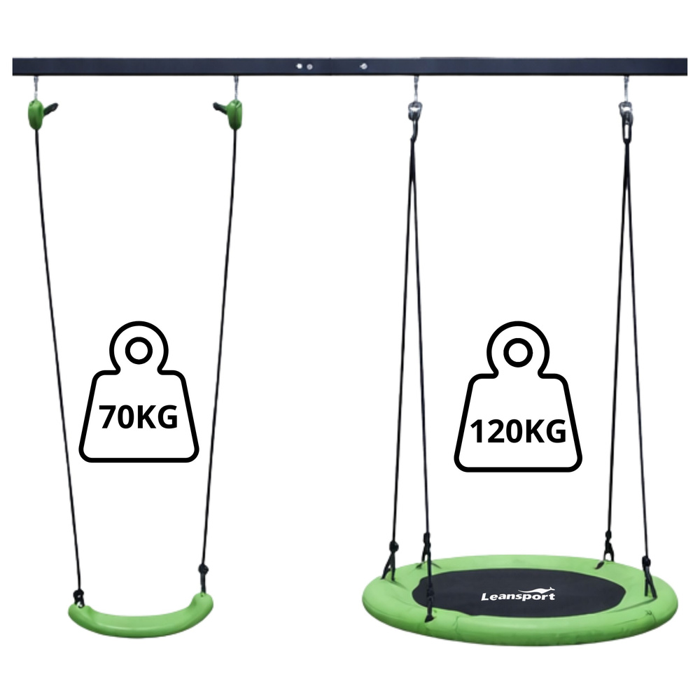 Komplet 2 v 1 vključuje dva sedeža, ki omogočata različno vrsto igre. Gugalnici sta opremljeni z močnimi vrvmi ustrezne dolžine, kar omogoča udobno in varno uporabo. Uporabljeni materiali so odporni na vremenske vplive, zato gugalnica dolgo ohrani svojo funkcionalnost in lep videz.