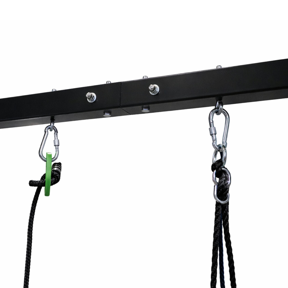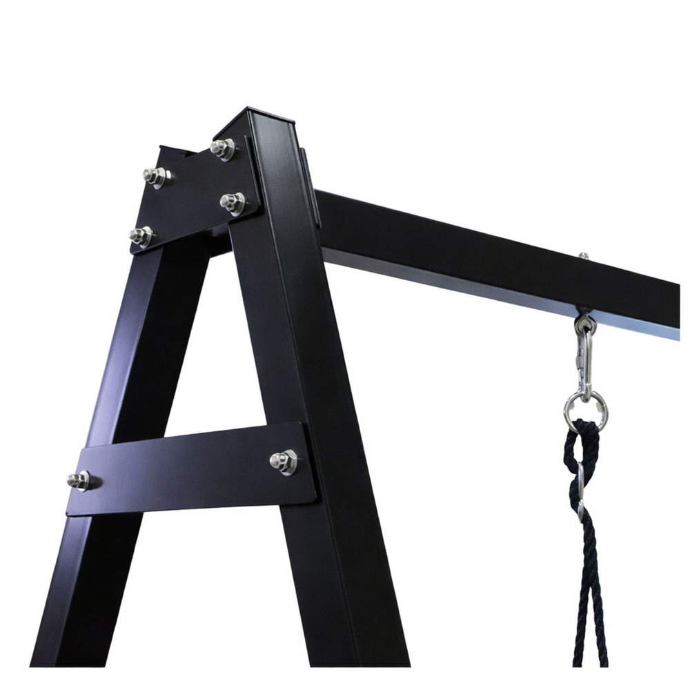 Trdna konstrukcija iz kvadratnih jeklenih cevi zagotavlja visoko stabilnost in odpornost na obremenitve. Okvir je dodatno ojačan, komplet sider pa omogoča varno pritrditev v tla, kar še poveča stabilnost in varnost med uporabo.