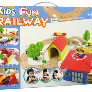 Lesena železnica Vlak Vagon Drevesa Zgradbe