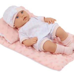 Punčka v beli pižami, kapa, odeja, blazina